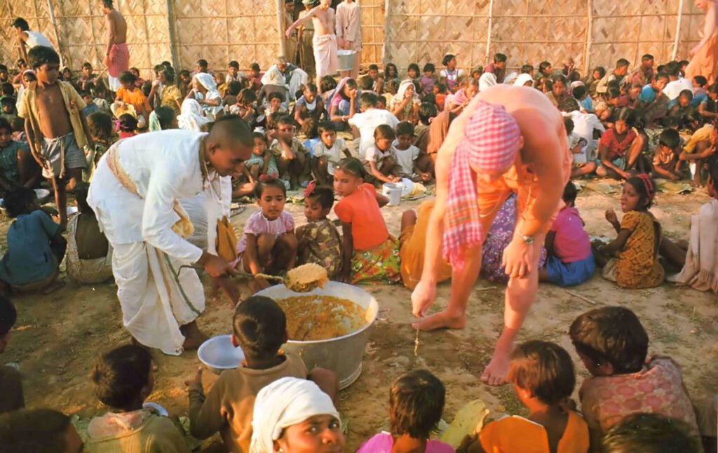 Srila Prabhupada says, “The Krishna Consciousness movement is based on this principle chant Hare Krishna as much as possible, and distribute Prasadam. If we believe that Krishna is providing and maintaining everyone, then why should we be misers? This means losing faith in Krishna , and thinking that we are the doers and suppliers. We are confident that Krishna will supply! Let the whole world come, we can feed them”. Simply by liberal distribution of Pradasam and Sankirtan, the whole world can become peaceful and prosperous. “Food For Life” program is an important activity of ISKCON Pune. Food for life is a unique free food distribution program, which simultaneously satisfies the body by providing first class vegetarian meals for everyone. And it satisfies the soul because the food is prepared by temple devotees and offered to Lord Krishna before it is distributed. Thus it becomes Krishna Prasadam, spiritual food that nourishes body and soul. In the Bhagavad Gita it is stated, “The devotees of the Lord are released from all kinds of sins because they eat food which is offered first for sacrifice.” Others, who prepare food for personal sense enjoyment, verily eat only sin.